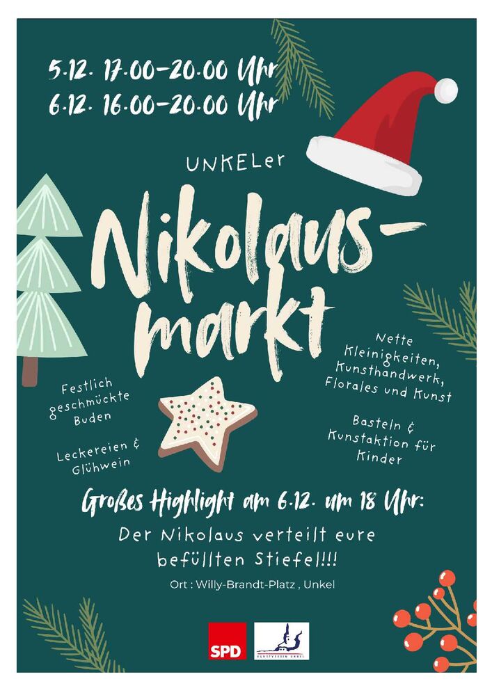 Ein besonderes Highlight erwartet die kleinen Besucher am 06. Dezember: Um 18.00 Uhr kommt der Nikolaus persönlich vorbei und bringt die zuvor abgegebenen, mit Süßem gefüllten Stiefel zurück. Damit setzt die SPD Unkel ihre beliebte Aktion „Süßes im Stiefel“ auch in diesem Jahr fort. Kinder können ihre Stiefel entweder im Elektrofachhandel Ralf Klein in der Frankfurter Straße 43 während der Öffnungszeiten abgeben oder direkt am 05. Dezember am Stand des Kunstvereins auf dem Nikolausmarkt.
